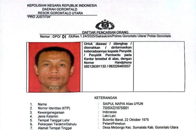 Kapolres Gorontalo Utara, AKBP Ahmad Eka Perkasa lewat Kasat Reskrim AKP Muhammad Arianto bilang, penerbitan DPO ini adalah langkah serius untuk mempercepat penangkapan pelaku.