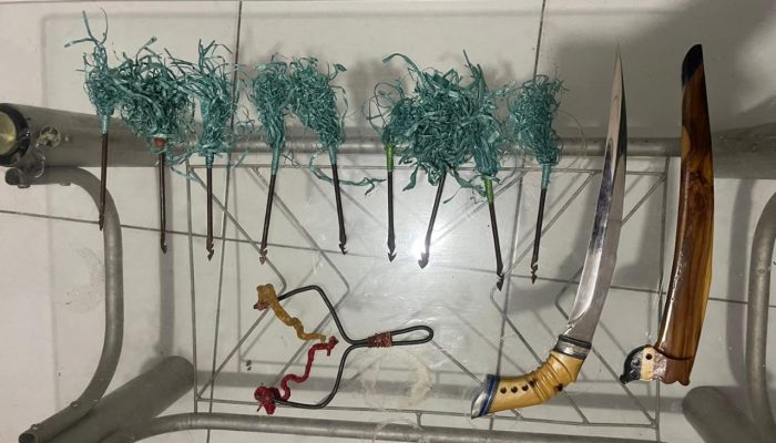 Nggak cuma pelaku, polisi juga nemuin, 9 anak panah (panah wayer),1 pelontar, 1 badik (yang disembunyiin di tempat temannya, tapi tetap ketahuan).