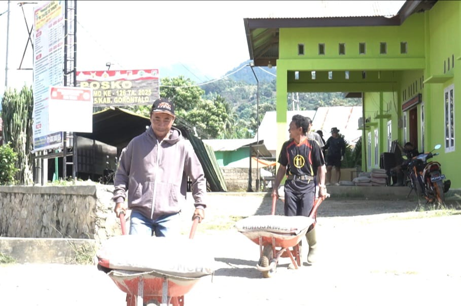 Warga dan Satgas TMMD ke-126 Kodim 1315/Kabupaten Gorontalo turun bareng ke lapangan, mendorong arco (gerobak dorong) penuh adukan semen buat ngebangun jalan yang udah lama mereka impikan.